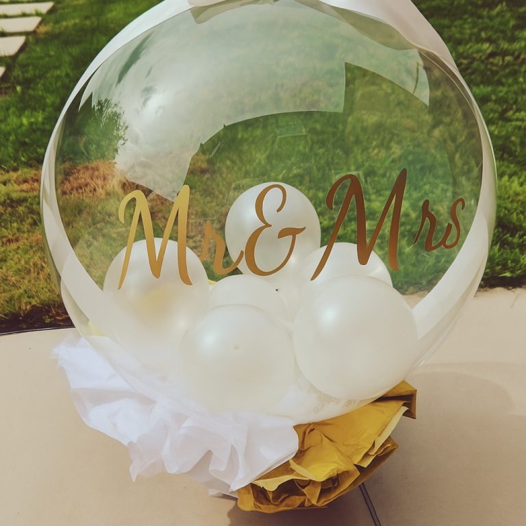 Elegant personalized balloons with names and dates to mark your big day in style.